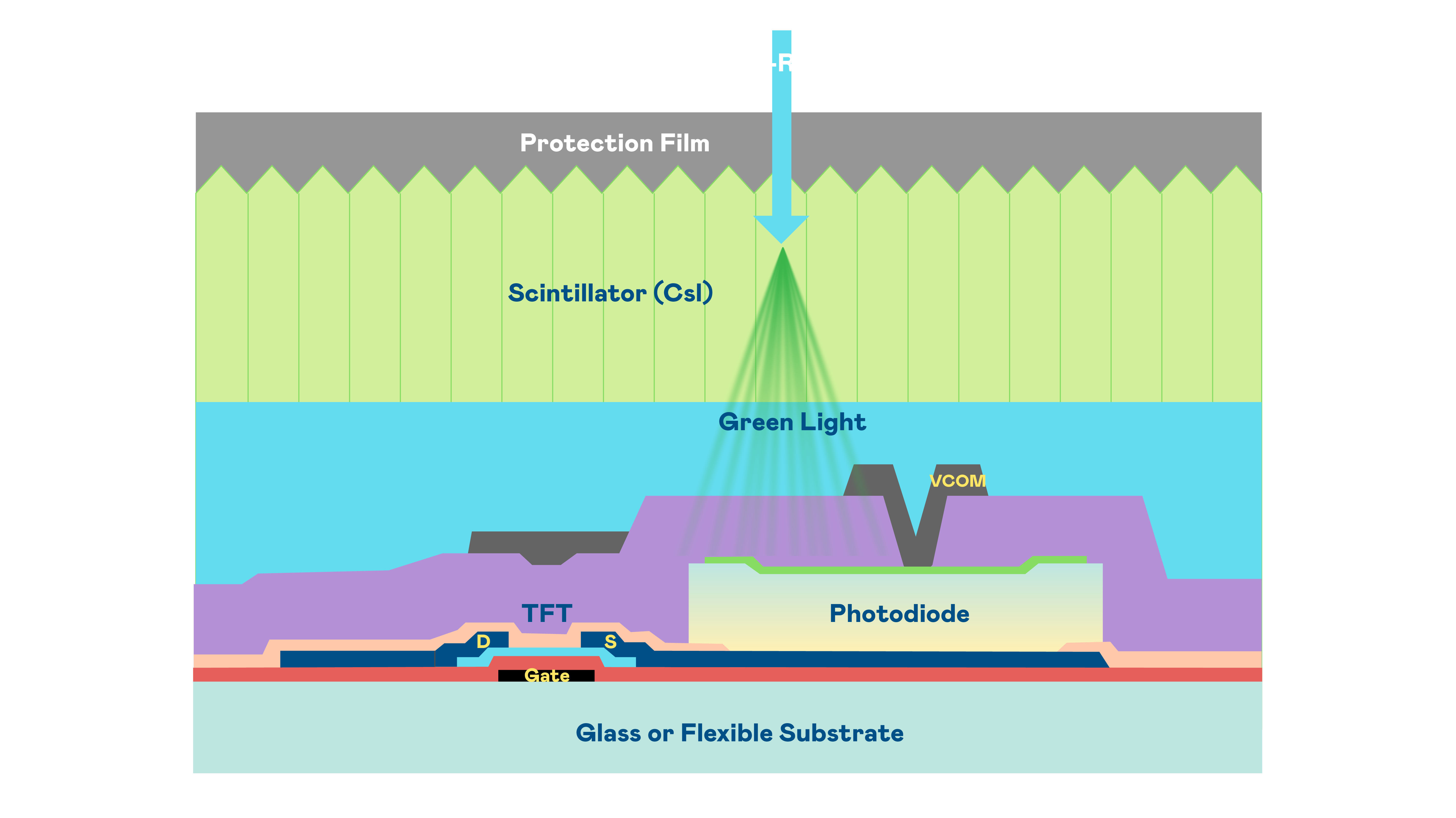 918博天堂的X光影像感测阵列使用薄膜电晶体 (TFT) 作为每个像素的读取开关,搭配光电二极体(Photodiode)的光电转换元件,用以感测X光影像讯号。